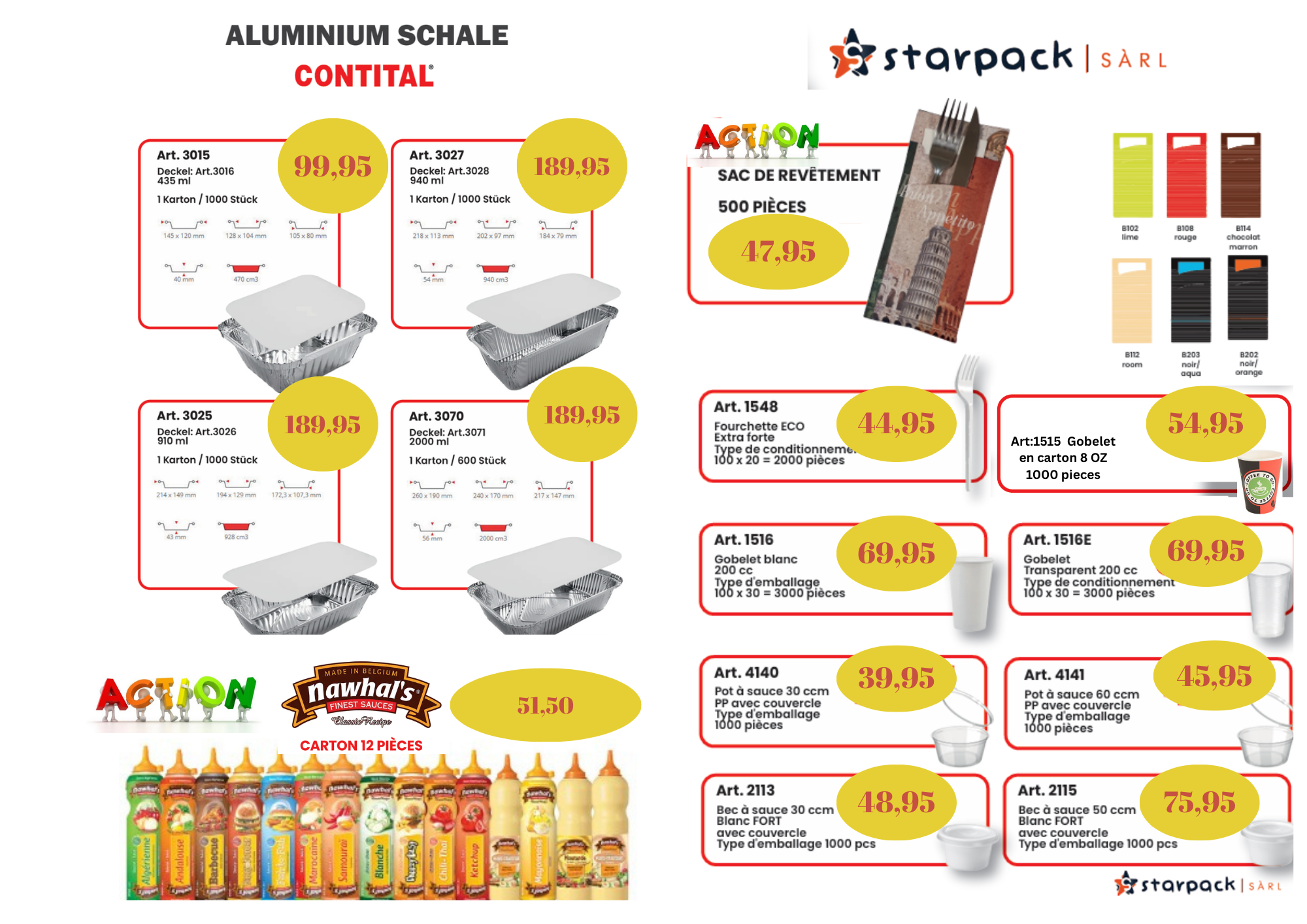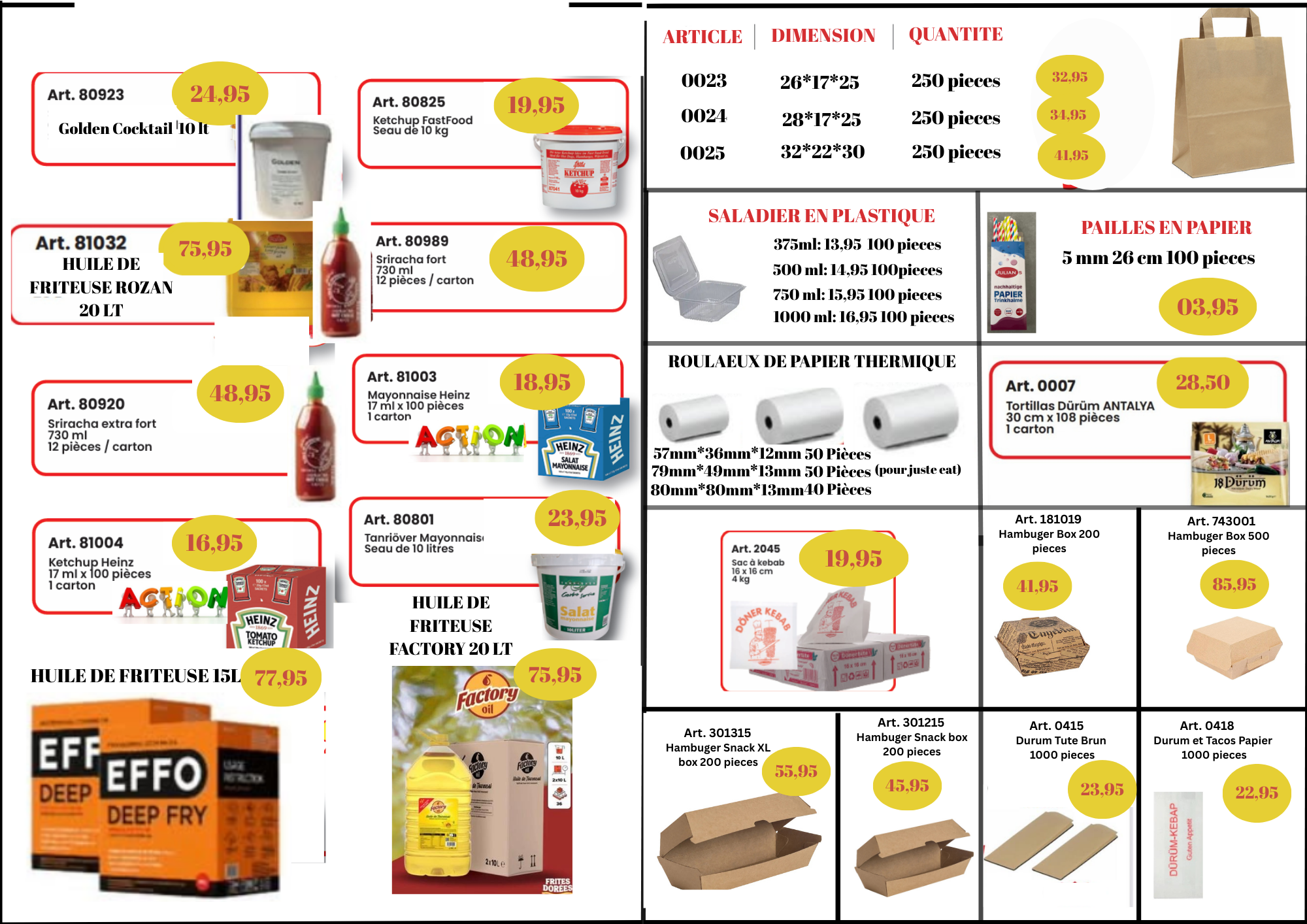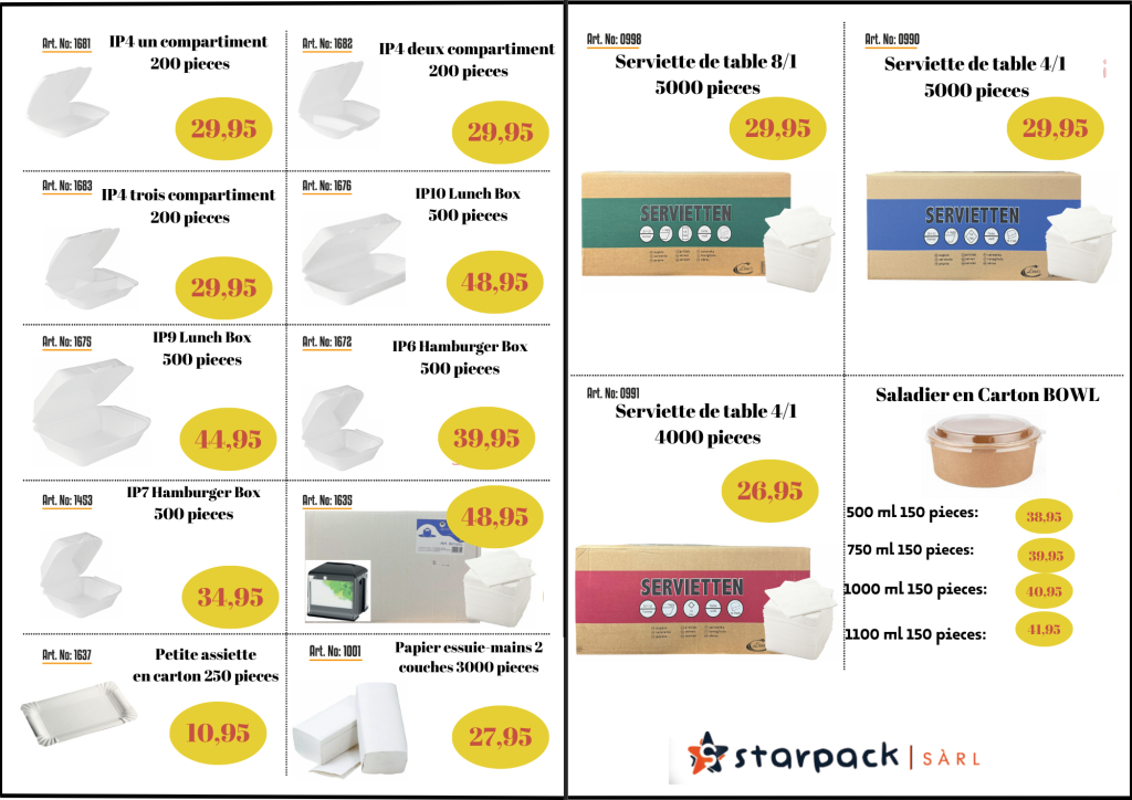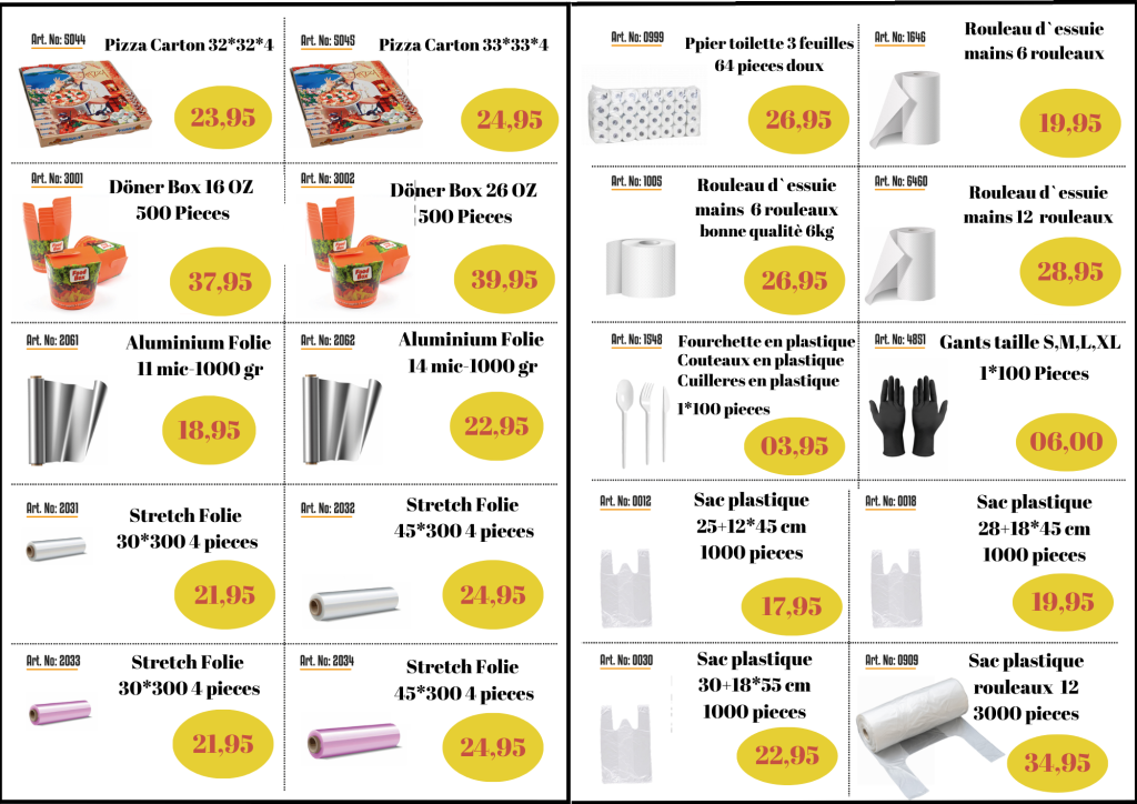 Notre Catalogue de Produits Leader de la distribution et de la fabrication de vaisselle jetable et d’emballages alimentaires CATALOGUE Innovation Les meilleures technologies d’emballage pour protéger vos produits. Consultation Notre expérience provient de nos années d’activité dans le secteur de l’emballage. Qualité Matériaux sélectionnés de haute qualité pour des produits sûrs et certifiés. Solutions adaptées à vos besoins Nous trouvons la meilleure solution selon vos besoins.